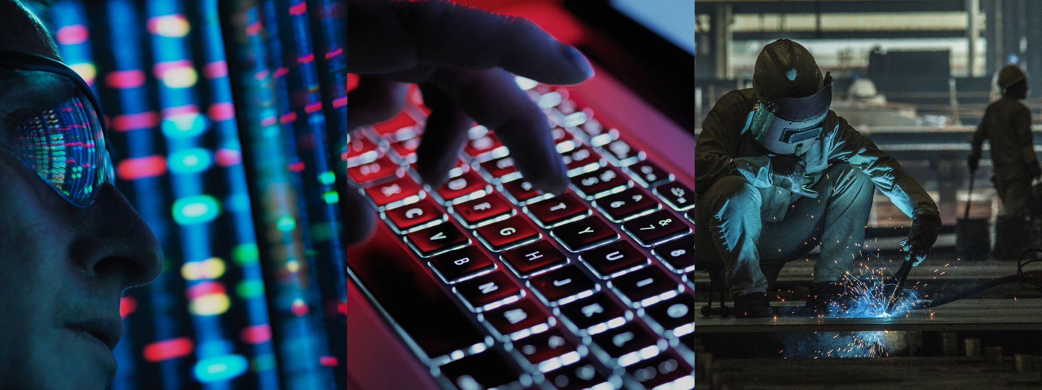Close-up of data reflections in glasses, fingers typing on a lit keyboard, and a worker welding in an industrial setting.