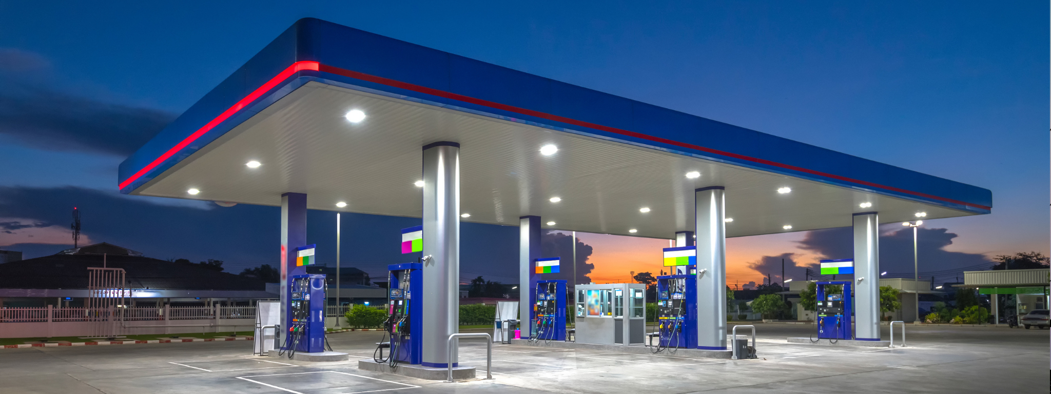 A well-lit gas station at dusk with multiple fuel pumps and a convenience store in the background.